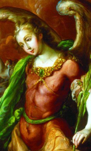 - Añada poco a poco a los Querubines y Tronos regordetes y chapeados, salteados a ambos lados; Ahora ponga mucho cuidado al añadir al Arcángel Gabriel del lado derecho salteado en colores rojo, verde y dorado, con dos alas blancas, grandes y fuertes, además de agregar un lirio largo en la mano izquierda.