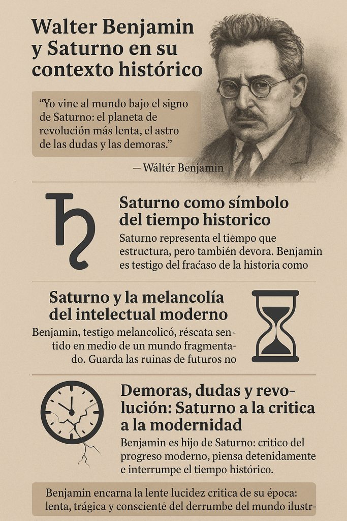 Benjamin, pensador de lo trágico y lo fragmentario, se reconoce como hijo de Saturno, marcado por la duda, la demora y el pensamiento profundo, no por la acción o la expansión. Su obra está atravesada por la tensión entre tiempo histórico y memoria, por el dolor de la pérdida y el intento de rescatar lo desaparecido.