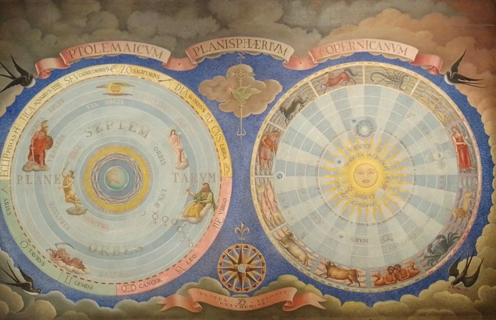 La obra nos muestra de manera visual la Visión Ptolemaica (Geocéntrica) y Copernicana (Heliocéntrica) de ver el universo o cosmos