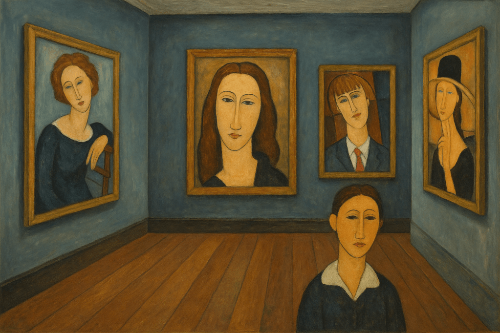 En los retratos de Amedeo Modigliani, la forma se convierte en lenguaje esencial. Las figuras se alargan, los rostros se estilizan, los cuellos se extienden como columnas de un templo interior.
