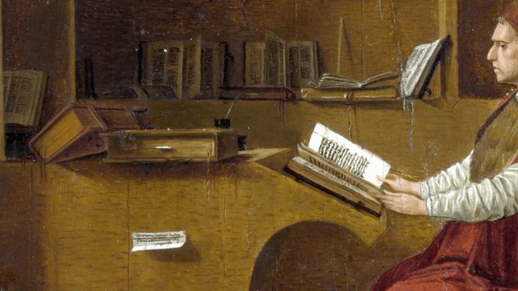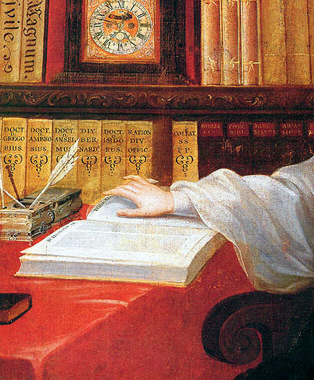- El libro aquí define la identidad del personaje, no vemos a un santo triunfante ni a un mártir dramático, sino a un pensador trabajando. La santidad aparece asociada al estudio disciplinado, la lectura atenta y la escritura paciente. Esta idea fue especialmente importante para el Renacimiento, época que valoró la recuperación de textos clásicos y la figura del intelectual humanista.