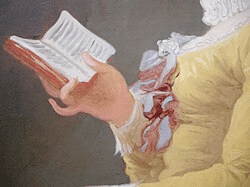 El libro ocupa aquí un lugar central en la composición pese a su pequeño tamaño que cabe en la palma de su mano. Fragonard lo coloca en el punto de encuentro entre la mirada de ella y sus manos, creando un eje visual directo. Todo nos lleva hacia ese objeto: la inclinación del rostro, la postura recogida, el gesto atento. El libro organiza la escena y da sentido a la actitud de ambos personajes.