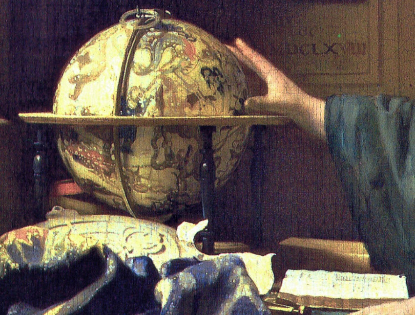 Esta obra destaca la investigación científica y el deseo humano de comprender el universo. Vermeer da a una escena interior e intima, aparentemente sencilla, un caracter de reflexión profunda sobre el conocimiento.
